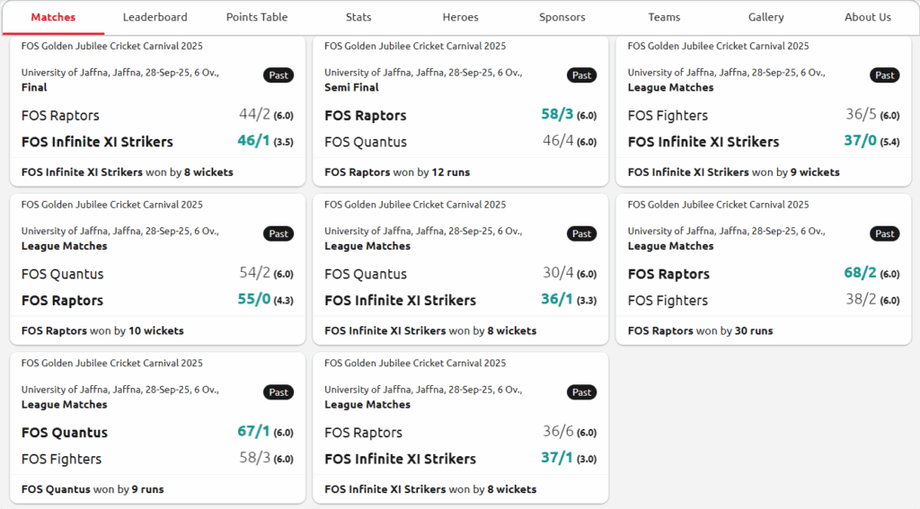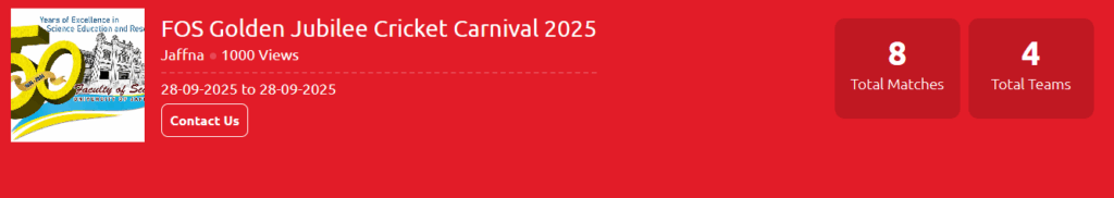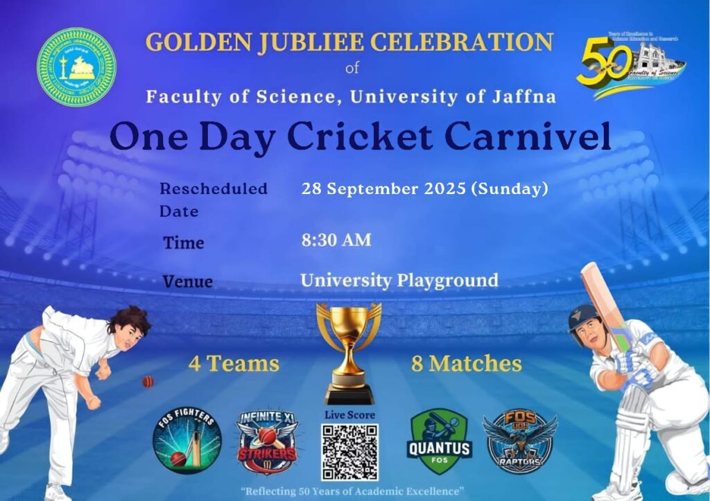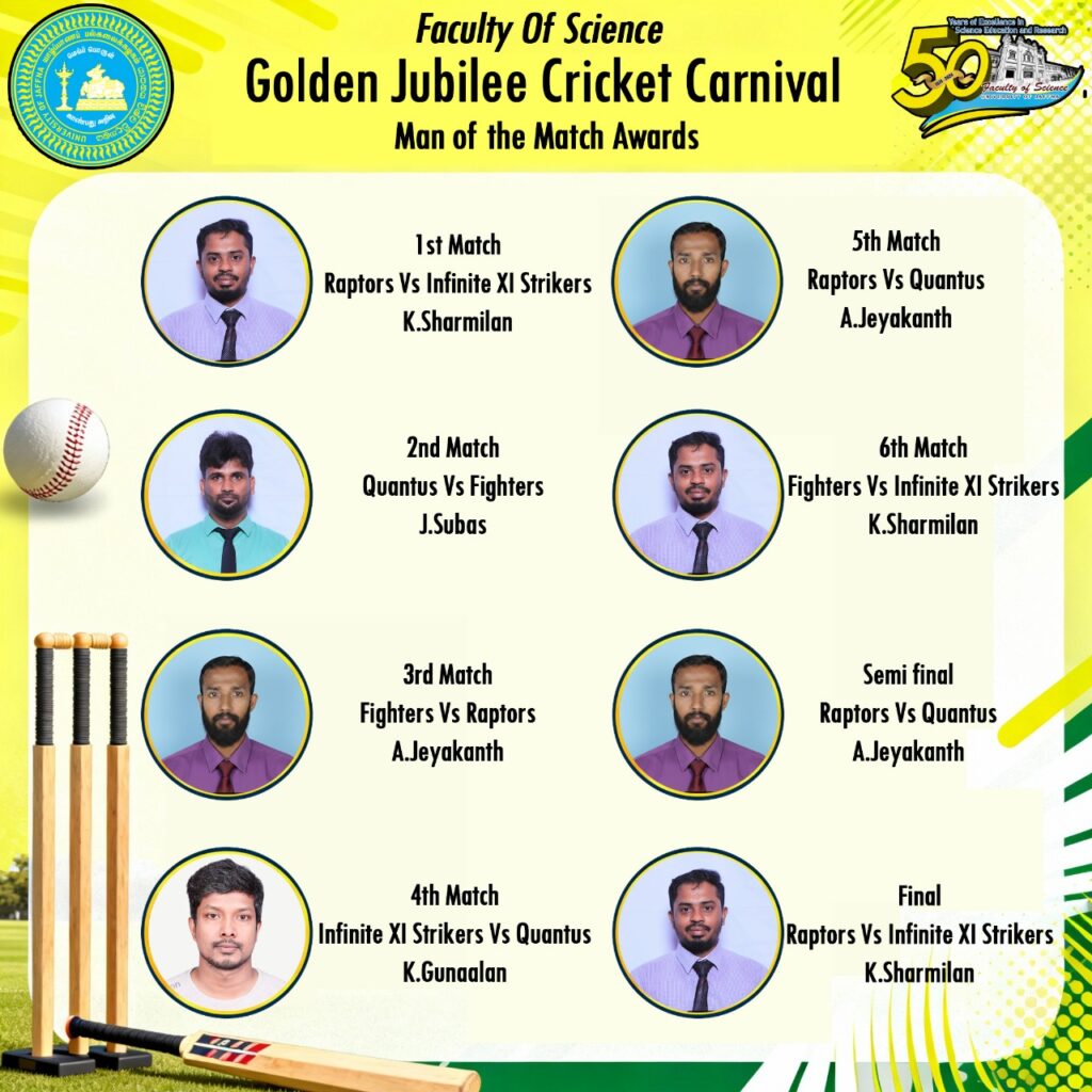 We extend our heartfelt appreciation to all those who contributed to the successful conduct of the Cricket Carnival. Special thanks are due to the Dean, Heads, and all Faculty Members for their encouragement and support, as well as to the Golden Jubilee Committee for their invaluable assistance. We are also grateful to the Director and staff of the Physical Education Unit for their cooperation, and to the match officials—R. Vithusanth, D. Sugirthan, K. Thuvarakan, and S. Loysanth—for their dedicated service. Our sincere thanks go to S. Kabilthev, the groundsman, for his excellent work in preparing and maintaining the grounds. We also acknowledge the efforts of V. Christynath for managing the auction process and T. Kokulraj for serving as the auctioneer.